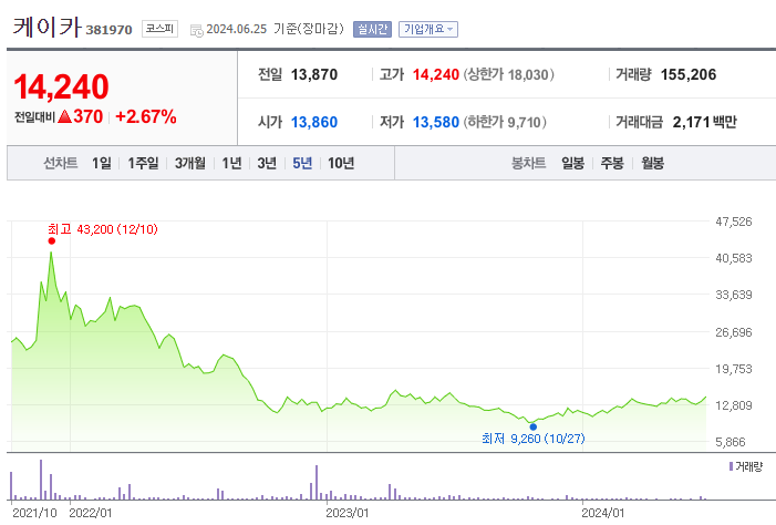 케이카는 지난 '21년 상장하여, '21년 말에 최고점을 기록한 뒤, 지속적으로 하락 후 보합세를 유지하고 있습니다. 사실 그래서 주식 자체의 매력이 크지는 않지만, 배당수익률이 괜찮은 주식이라 배당 관점에서 접근하시는 편이 좋을 듯 합니다.