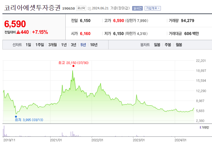 코리아에셋투자증권의주가는 지난 팬데믹 기간 외에는 대체로 보합세를 유지하고 있습니다.
