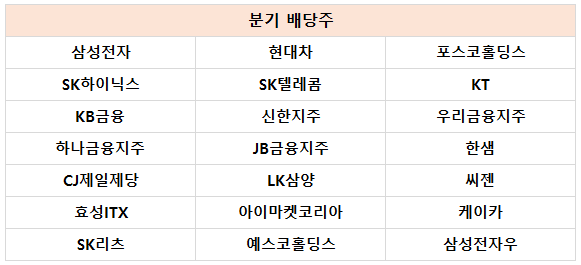 1. 분기 배당 기업 List삼성전자를 비롯하여 전체 19개 기업들은 1분기에 아래와 같이 배당을 실시 하였습니다. '24년부터는 JB금융지주와 KT도 분기 배당에 합류하며, 주주환원에 박차를 가하고 있