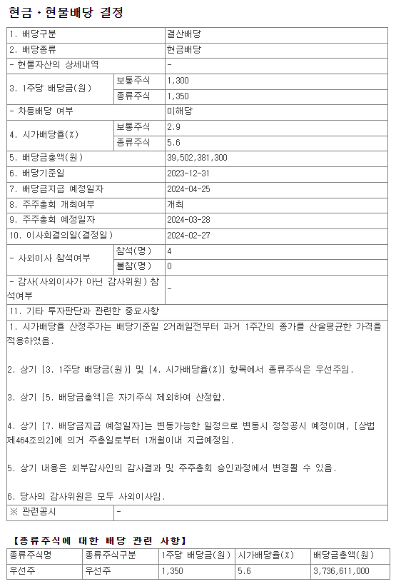 배당금 : 1,300원 (보통주) / 1,350원 (우선주)