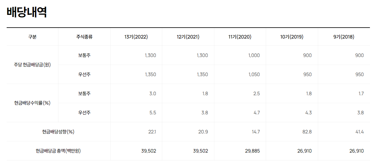배당금 : 1,300원 (보통주) / 1,350원 (우선주)