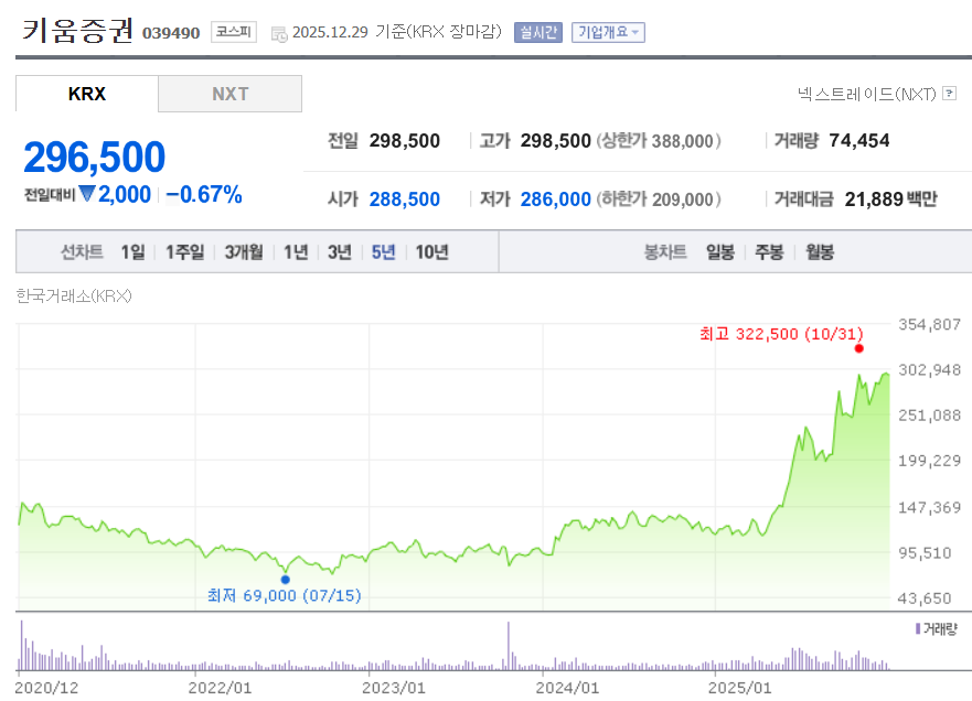 키움증권의 최근 주가는 **29만 원대 중후반(약 29만 6천 원 수준)**에서 거래되고 있으며, 지난 1년 동안 약 10만 7천 원에서 32만 2천 원 사이의 큰 변동폭을 보였습니다. 증권업 업황 회복과 함께 위탁매매(브로커리지) 거래대금 흐름, IB·자산관리 부문 실적, 그리고 주주환원 기대 등이 주가의 핵심 배경으로 작용하고 있습니다. 밸류에이션 측면에서는 PER·PBR이 업황과 실적 사이클에 따라 변동하지만, 실적이 개선되는 구간에서는 부담이 완화되며 재평가 여지가 언급되기도 합니다. 배당은 업황에 따라 탄력적으로 평가받는 편이라 배당만 보고 접근하기보다는 실적 사이클과 거래대금 환경을 함께 보는 것이 중요합니다. 다만 금리·시장 변동성 확대, 거래대금 둔화, 경쟁 심화 등은 향후 실적과 주가에 영향을 줄 수 있는 리스크 요인입니다.