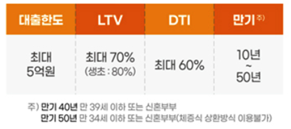 - LTV 최대 70%(생애 최초 구입의 경우 최대 80%), DTI 최대 60% 적용