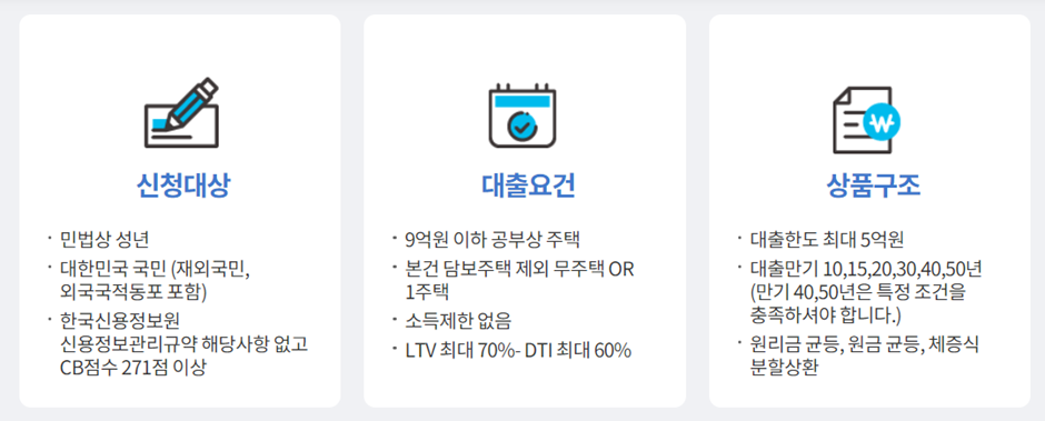 - KB 시세를 기준으로 9억원 이하의 주택, 소득제한 없음(기존 보금자리론은 소득 7천만원 이하만 신청 가능)