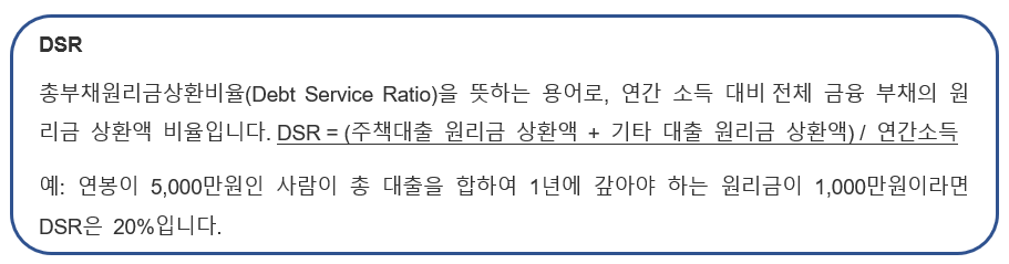 DSR은 주택담보대출 원리금에서 다른 곳에서 빌린 대출금의 원금과 이자를 모두 더한 원리금 상환액으로 심사