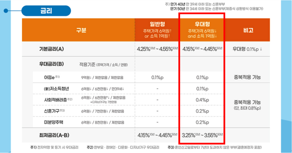 - 최저금리 기준 일반형 (4.15%~4.45%), 우대형 (3.25%~3.55%)