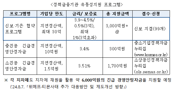 - 신용보증기금 - 기업은행 금융지원 총 3,000억원 (기업당 한도 최대 30억원, 금리 3.9~4.5%)