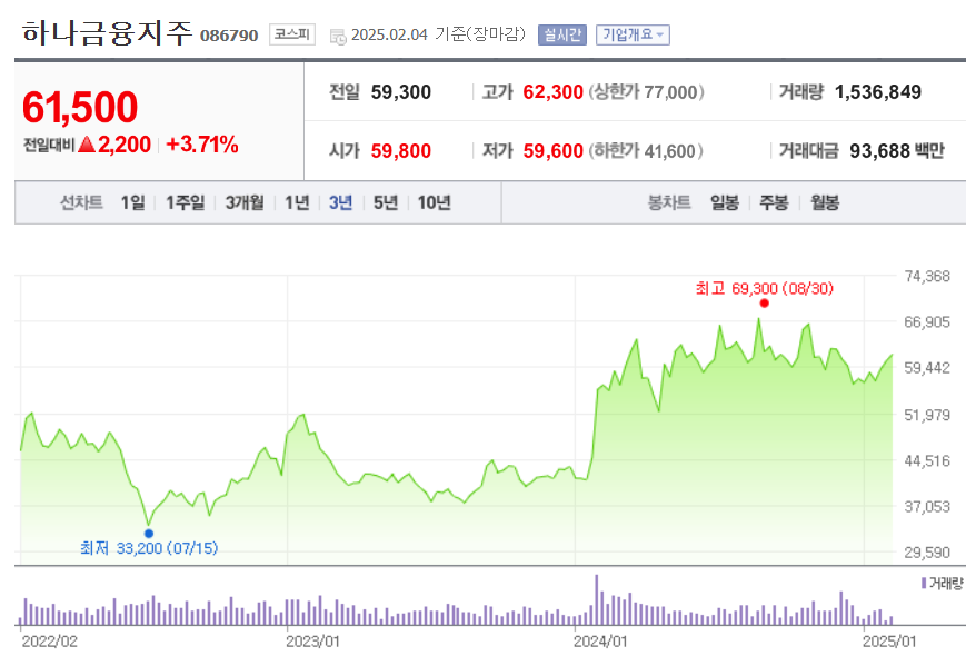 지난 5년간의 하나금융지주 주가를 살펴보면, 팬데믹 기간을 제외하고는 타 종목 대비 큰 변동 없이 보합세를 유지하고 있습니다. 사실 그래서 주식 자체의 매력이 크지는 않았지만, '24년 초부터 저PBR 종목들이 각광 받으면서, 하나금융지주 주가도 급 상승 하였습니다. 최근에는 트럼프 행정부 집권에 따른 높은 변동성과 지정학적 Risk 등으로 인해 증시가 전반적으로 좋지 않아 하나금융지주 주가 역시 보합세를 보이고 있습니다.