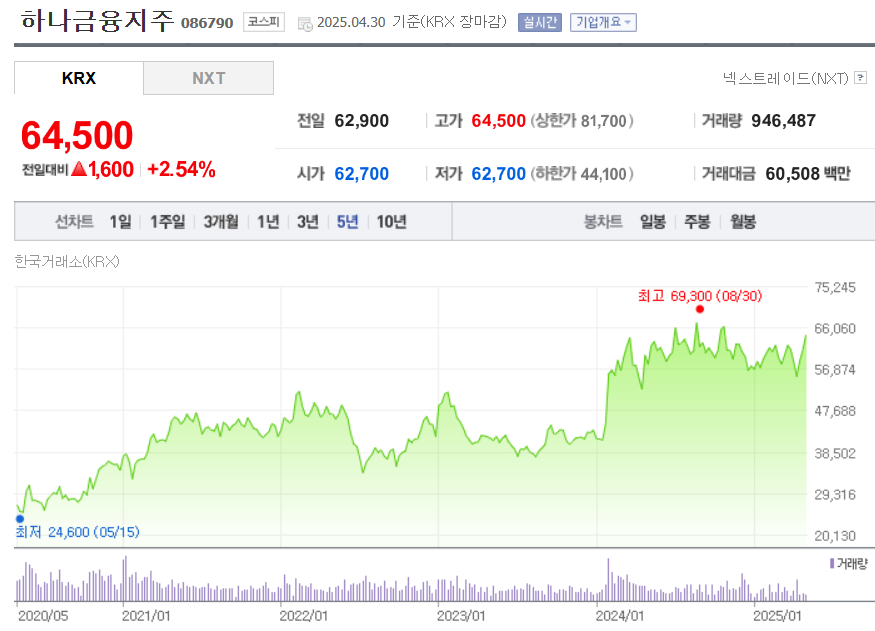 지난 5년간의 하나금융지주 주가를 살펴보면, 팬데믹 기간을 제외하고는 타 종목 대비 큰 변동 없이 보합세를 유지하고 있습니다. 사실 그래서 주식 자체의 매력이 크지는 않았지만, '24년 초부터 저PBR 종목들이 각광 받으면서, 하나금융지주 주가도 급 상승 하였습니다. 최근에는 트럼프 행정부 집권에 따른 높은 변동성과 지정학적 Risk 등으로 인해 증시가 전반적으로 좋지 않아 하나금융지주 주가 역시 보합세를 보이고 있습니다.
