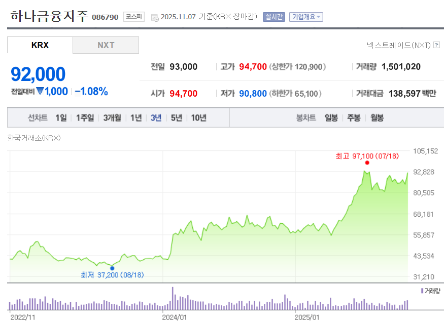 하나금융지주의 최근 주가는 약 92,000원대에서 형성되어 있으며, 지난 1년간 52주 최저 약 51,500원, 최고 약 97,100원 구간을 보였습니다.