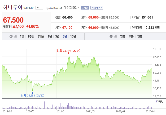 하나투어 주가 (출처 : 네이버 증권)