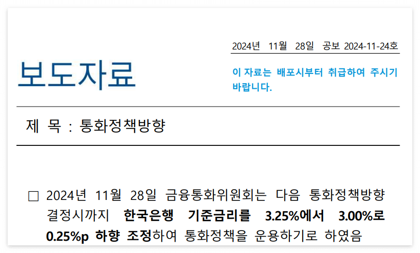 한국은행이 11월 28일 진행된 금융통화위원회에서 기준금리를 3.25%에서 3.00%로 0.25% 하향 조정하여 통화정책을 운용하기로 하였습니다.