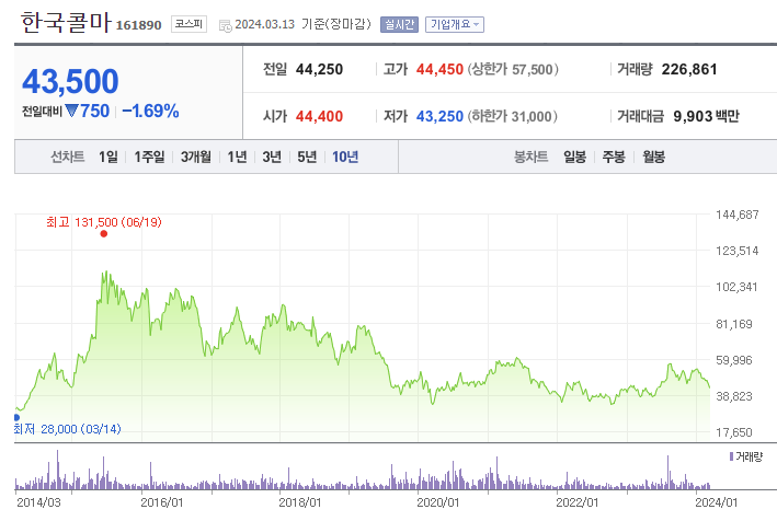 한국콜마는 지속적인 실적 하락으로 인해 하락한 주가가 회복하지 못 하고 보합세를 유지하고 있습니다. '23년은 전년대비 실적이 개선되었으나, 아직까지는 확실한 주가 상승의 모멘텀을 찾기는 어려운 상황으로 보여집니다.
