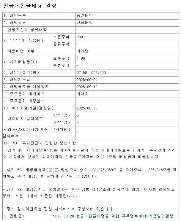 - 중간배당이 처음 시행된 만큼 향후 연속성과 규모 확대 여부가 투자자 신뢰의 핵심이 됩니다.