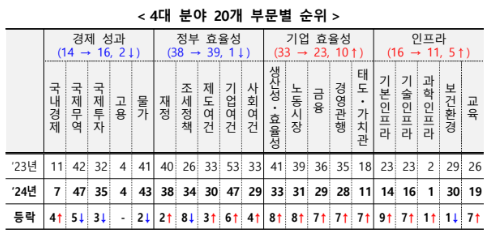 4대 분야를 살펴보면, 경제 성과와 정부 효율성은 순위가 하락하였으나, 기업 효율성과 인프라가 각각 10계단, 5계단 뛰어 오르며, 한국의 순위를 끌어 올렸습니다. 특히나 기업 효율성에서 많은 개선이 이뤄지며 금번 역대 최고 순위 기록을 뒷받침 하였습니다.