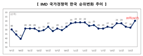 한국은 지난 '22년에 27위를 기록하였다가, '23년에는 28위로 한 계단 순위가 내려갔습니다. 다만, '24년에는 20위로 순위가 껑충 뛰어오르며, 역대 최고 순위를 기록하였습니다.