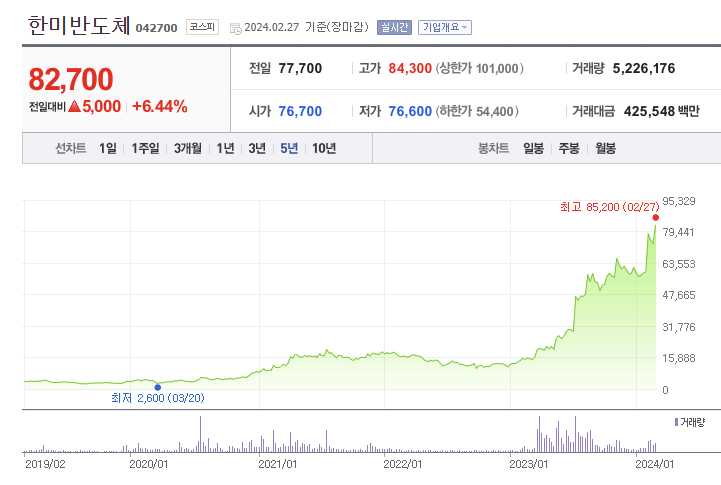한미반도체의 주가는 지난 '20년까지만 해도 만원 이하에 머물고 있었으나, '23년초 생성형 AI 'CHAT GPT' 열풍을 타고 수혜를 받을 것으로 예상되며 주가가 폭등하였습니다. 현재 주가는 거품이 끼었다는 주장도 있으나, 일부에서는 압도적 기술 우위를 바탕으로 신규 고객사 확대 가능성이 크다는 전망을 내놓고 있어 향후 추이를 주목해 봐야 할 것 같습니다.