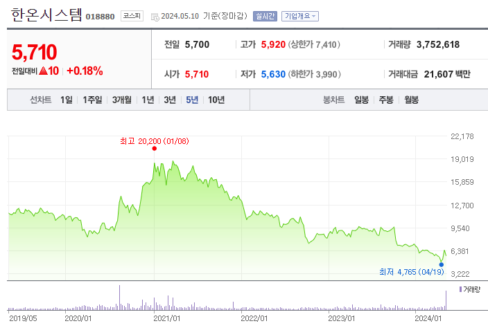 한온시스템의 주가는 지난 '21년초 전고점을 기록한 이후 지속 하락세를 기록하고 있습니다. 이는 '21년 이후 내림세를 걷고 있는 실적과도 무관하지 않아 보입니다. 또한 최근에는 한국타이어에서 인수한다는 소식에 하루에만 13%가 주가가 폭락하는 등, 현재 주가는 상당히 약세를 보이고 있습니다.