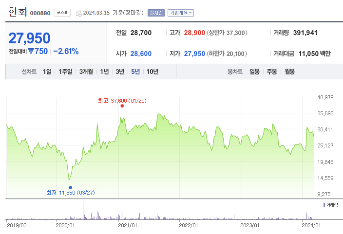 한화는 한화그룹의 지주사 역할을 하고 있으며, 한화생명, 한화에어로스페이스, 한화케미칼 등 주요 계열사의 지분을 보유, 또한 자체사업은 화약/방산/기계/무역 부문이 있습니다. 주가는 지속적으로 보합세를 유지하고 있으나, 최근 주요 계열사들의 가치 상승 및 글로벌 부문 매출 증가에 따른 주가 상승이 기대된다는 증권사 리포트들이 나오고 있는 상황입니다.