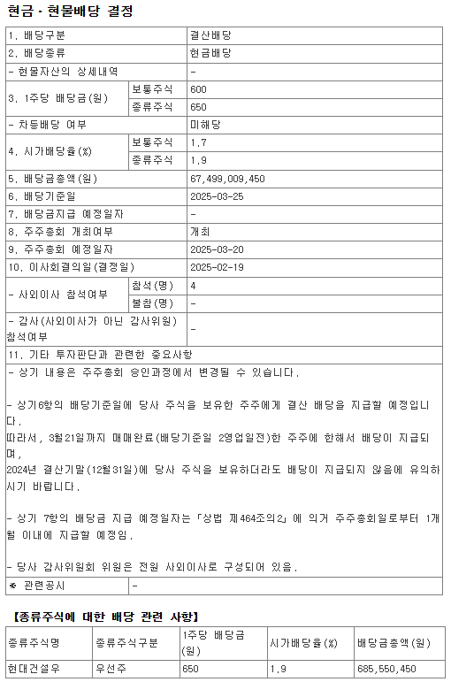 배당 조건(기준일) : 2025-03-25일까지 현대건설 주식 보유