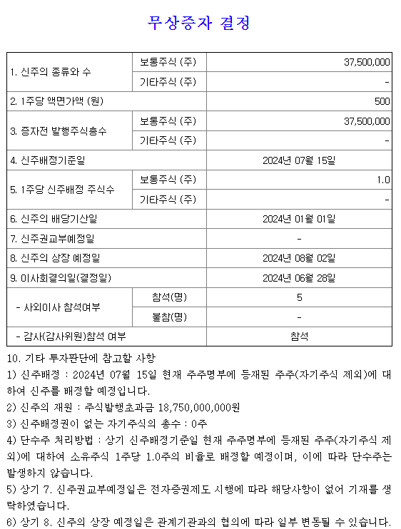 * 무상증자 예정일 : 2024-07-15