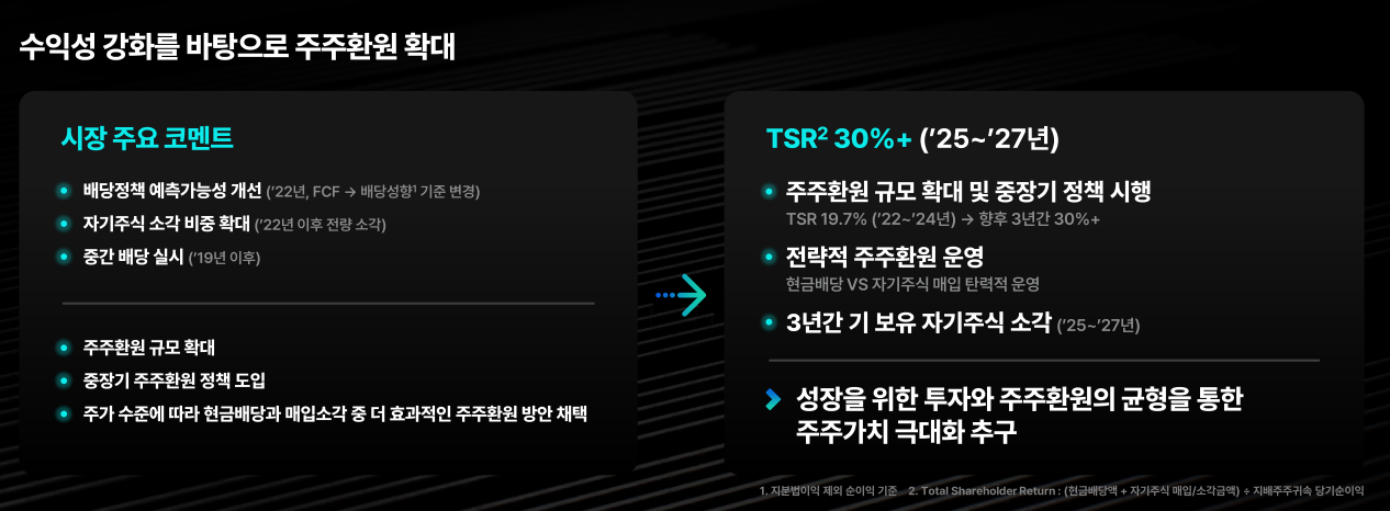 현대모비스는 주주환원 규모를 늘려, 25~27년은 TSR 30% 이상을 기록하겠다는 계획입니다. 정확히 배당과 자사주 매입 및 소각을 얼마를 하겠다는 계획보다는, 주가 수준에 맞춰 좀 더 유리한 방안을 채택할 예정입니다. 또한, 향후 3년간 현재 2.85%에 달하는 자사주를 모두 소각하겠다는 계획도 발표하였습니다.