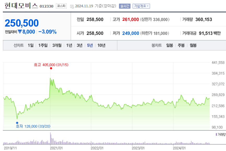현대모비스의 주가는 지난 팬데믹 이후 지속적으로 보합권을 유지하고 있으며, 주가 상승에 어떤 모멘텀이 부족한 상황입니다.