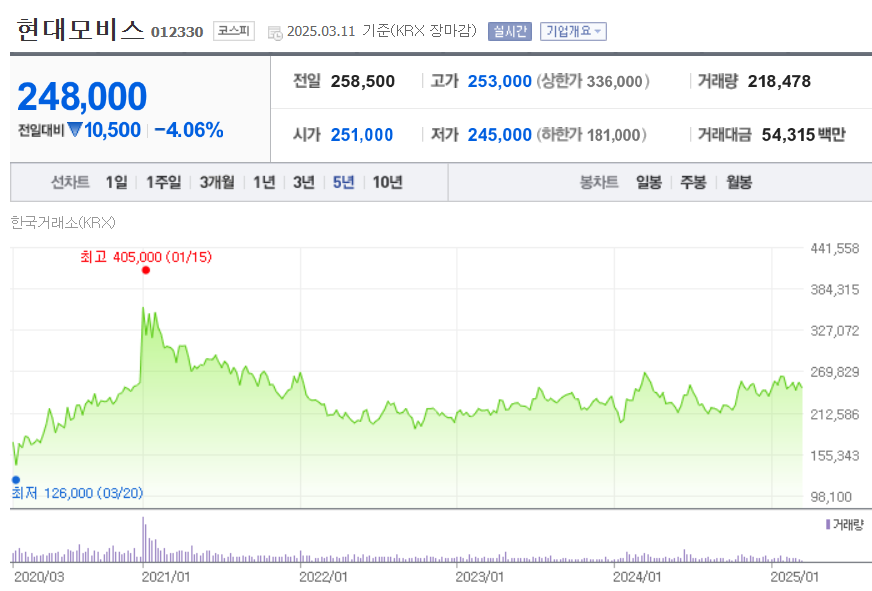 현대모비스의 주가는 지난 팬데믹 이후 지속적으로 보합권을 유지하고 있으며, 주가 상승에 어떤 모멘텀이 부족한 상황입니다.