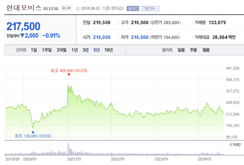 현대모비스 주가 (출처 : 네이버 증권)