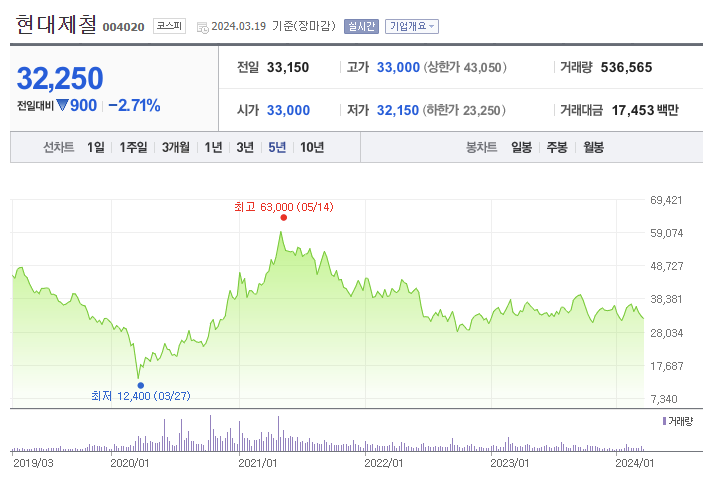 현대제철 주가는 지난 팬데믹 기간 일부 등락이 있었던 것을 제외하면 지속적으로 보합세를 보이고 있습니다. 안정적인 수익은 창출하고 있으나, 주가 상승의 모멘텀은 다소 부족한 상황인 것으로 보입니다.