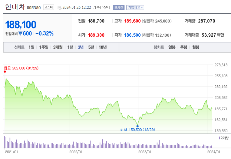 현대차의 최근 주가 흐름을 보면, 작년 말 최저점을 기록한 뒤, 상승 추이에 있습니다.