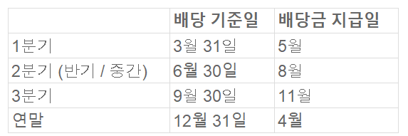 삼성전자를 비롯하여 일부 기업들은 1분기에 아래와 같이 배당을 실시 하였습니다. 현대차도 향후 분기 배당 List에 포함될 예정이며, 한국도 점차 분기 배당 기업이 증가하는 추세입니다.