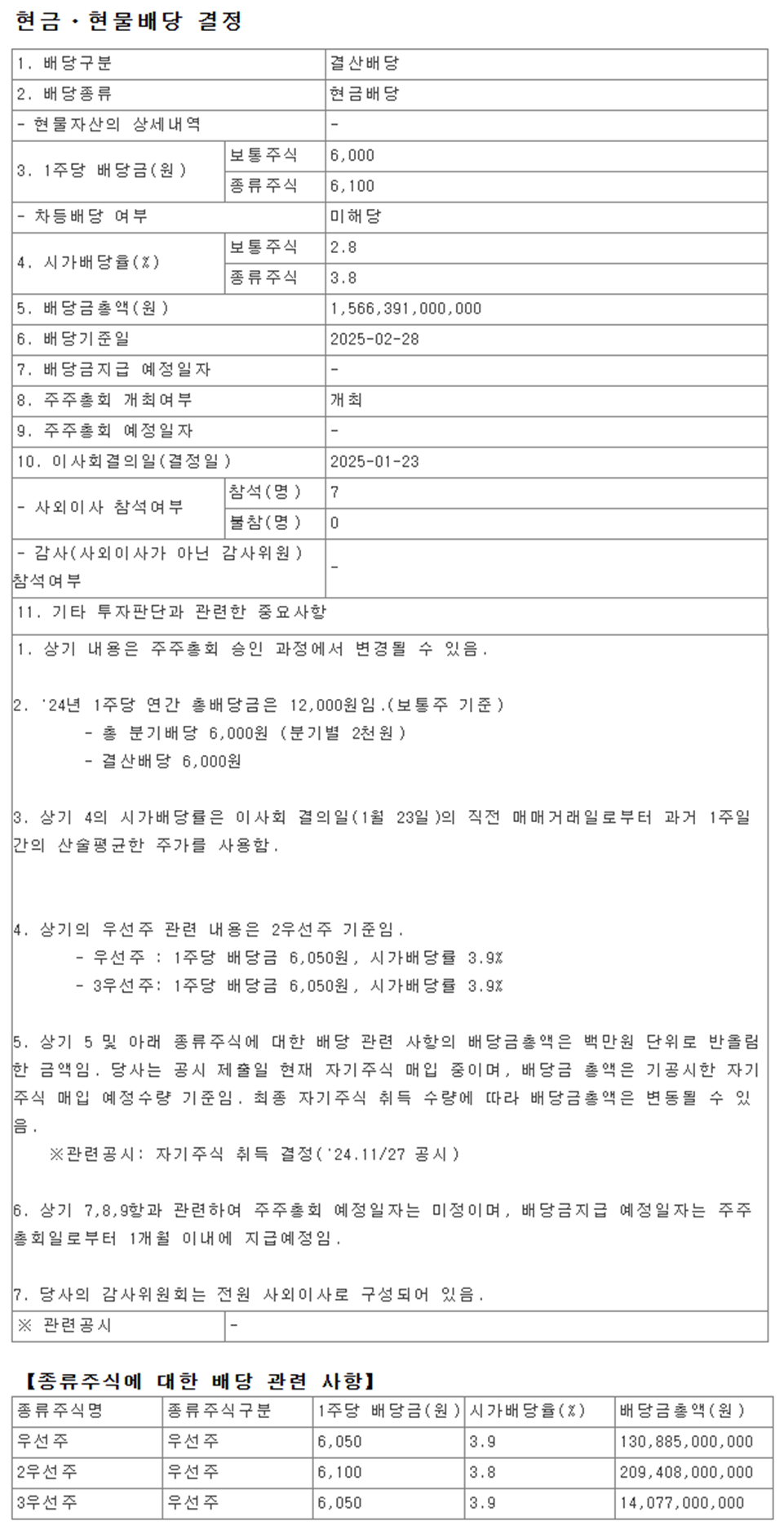 배당금 : 6,000원 (보통주) / 6,100원 (우선주)