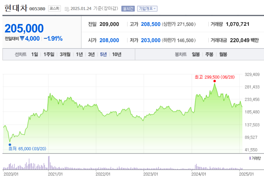 1.  현대차  실적 및 주가현대차는 최근 2~3년간 지속적인 약보합세를 유지하다가, '24년 초부터 주가가 급등하기 시작하였습니다. 현대차의 주가는 정부의 밸류업 지원계획 수혜에 대한 기대감,