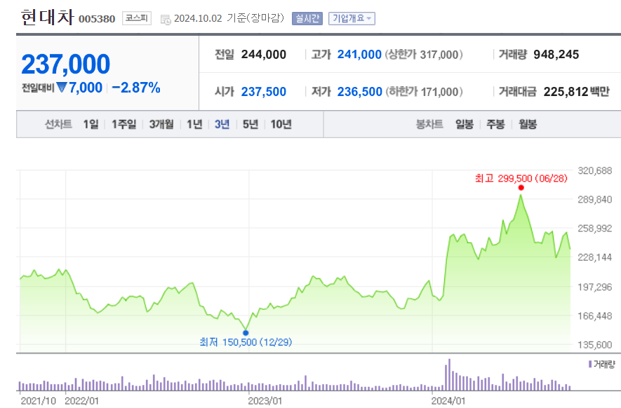 1. 현대차 주가현대차는 최근 2~3년간 지속적인 약보합세를 유지하다가, '24년 초부터 주가가 급등하기 시작하였습니다. 현대차의 주가는 정부의 밸류업 지원계획 수혜에 대한 기대감, 실적