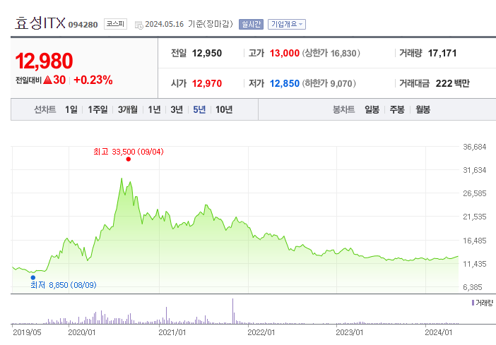 효성 ITX의 주가는 지난 팬데믹 시기 급등하였다가, 다시금 지속 하락하며 현재는 팬데믹 이전과 유사하게 큰 변동없이 보합세를 유지하고 있습니다.