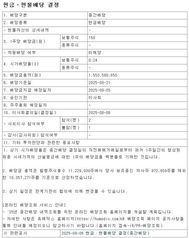 휴메딕스는 '25년 중간배당을 실시합니다.