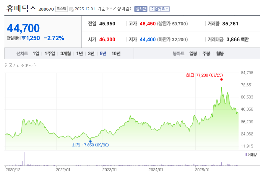 휴메딕스의 최근 주가 흐름은 다음과 같습니다. 현재 주가는 약 45,950원 수준이며, 지난 1년 동안 최저 약 31,050원, 최고 약 77,200원 사이에서 널뛰기한 모습을 보였습니다. 수익성 측면에서는 최근 실적이 개선되는 흐름이 있었고, PER과 PBR 등 밸류에이션 지표는 업종 대비 다소 유연한 편이라는 평가가 존재합니다. 휴메딕스는 필러와 피부 미용 관련 제품의 수출 확대, 스킨부스터 등 에스테틱 품목의 성장 기대감이 높아지고 있어 중장기 성장 모멘텀이 있다는 분석이 많습니다. 다만 제약·바이오 업종 특유의 임상 및 시장 규제 리스크, 수출 의존 구조, 경쟁 심화, 원자재 또는 원가 변동 등에 따라 실적과 주가가 크게 흔들릴 수 있다는 불확실성도 같이 갖추고 있습니다. 전반적으로 휴메딕스는 현재 밸류에이션 매력과 성장 기대가 맞물린 종목이지만, 투자 시에는 변동성과 리스크 또한 충분히 고려할 필요가 있는 기업입니다.