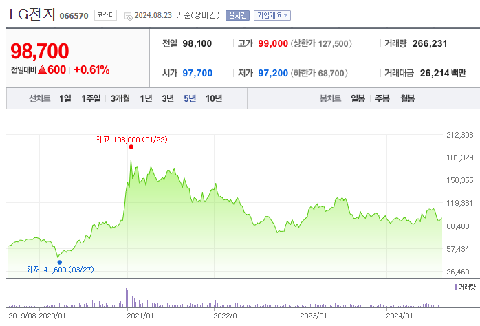 1. LG전자 주가LG전자는 팬데믹 이전만해도 주가가 크게 변동이 없었으나, 팬데믹 기간 최고점을 경신한 뒤, 현재는 주가가 다소 주춤한 상황입니다. 다만, '23년도에 역대 최고 매출을 경신하였