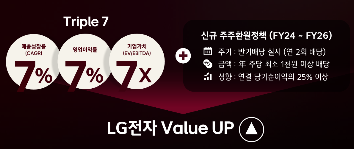 LG전자는 Triple7이라는 목표를 설정하고, 2030년 매출 100조원, 매출성장률 CAGR 7%, 영업이익률 7%, 기업가치 (EV/EBITDA) 7배 달성을 위해 노력해 나갈 예정입니다. 또한, 신규 주주환원 정책을 통해, 반기배당을 실시하고 , 매년 1천원/주당 배당할 것을 약속했습니다.
