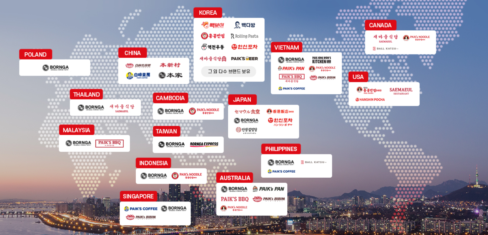 국내외 20여개 브랜드, 3,000여개의 직/가맹점을 운영 중인 자타공인 글로벌 외식 기업 THEBORN은 미국, 중국, 일본, 싱가포르, 인도네시아, 말레이시아, 필리핀, 베트남 등 세계 각 지역에 진출하여 한식의 우수함을 전파하고 있습니다.