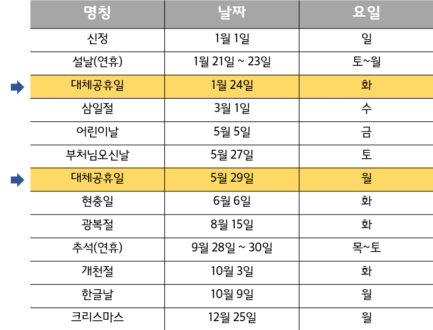 현재는 설, 추석, 어린이날과 4대 국경일(삼일절, 광복절, 개천절, 한글날)이 대체공휴일 적용 대상인데, 올해부터는 석가탄신일과 성탄절까지 대상에 포함되었습니다. 따라서, 5/27(토)인 석가탄신일로 인해, 5/29(월)이 대체 공휴일로 지정될 예정입니다.
