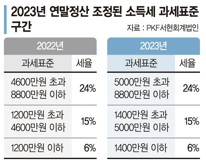 2023년 연말정산부터는, 세율 6%와 15% 구간의 과세표준이 확대