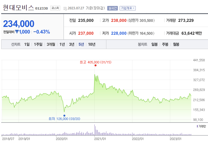 현대모비스의 주가는 아래 5년간의 차트와 같이, 지난 코로나 기간을 제외하고는 큰 폭의 등락 없이 보합세를 유지하고 있습니다. 다만, 2023년 2분기에 현대기아차가의 선전에 힘입어 함께 좋은 실적을 기록하면서 앞으로가 더욱 기대되는 모습입니다.
