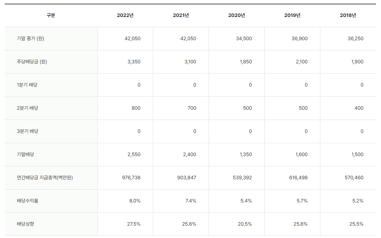 하나금융지주는 지난 '22년까지 반기 배당을 실시했으며, 매년 배당 수익률이 5% 이상이었고, '22년에는 배당수익률이 8.0%에 달하는 고배당주입니다.