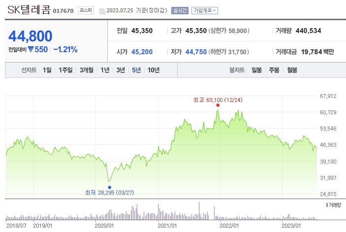 SK텔레콤의 지난 5년간 주가를 보시면, 코로나 시기를 거치며 다소 올랐었으나 대체로 변동폭이 크지 않습니다. 다만, 경기방어주이고 고배당주로써의 매력은 여전하다고 보여지며, 주가 상승을 보고 투자하는 것은 신중해야 할 필요가 있어 보입니다.