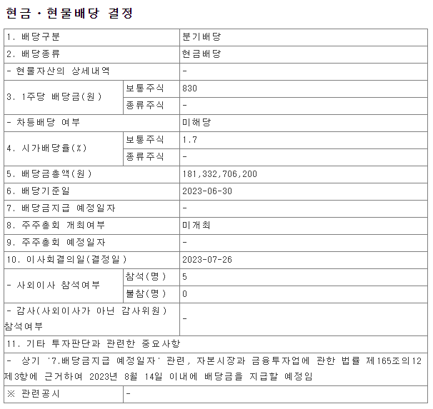 배당금 : 830원 (지난 '23년 1분기에도 주가 대비 1.7%인 830원 배당)