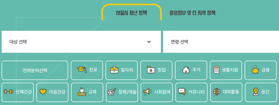 서울시에서 청년들의 사회 첫걸음을 응원하기 위해 취업, 주거, 생활지원, 문화/예술 등 다양한 분야에서 시행하는 청년 정책