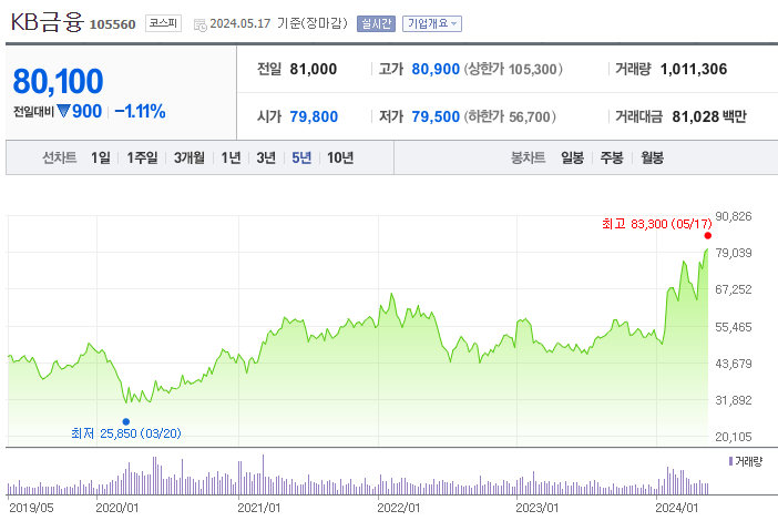 1. KB금융 실적 및 주가지난 5년간의 KB금융 주가를 살펴보면, 타 종목 대비 큰 변동 없이 보합세를 유지하고 있습니다. 사실 그래서 주식 자체의 매력이 크지는 않았지만, 최근 저PBR 종목들이