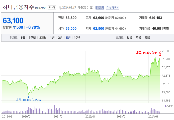 1. 하나금융지주 실적 및 주가지난 5년간의 하나금융지주 주가를 살펴보면, 팬데믹 기간을 제외하고는 타 종목 대비 큰 변동 없이 보합세를 유지하고 있습니다. 사실 그래서 주식 자체의 매력